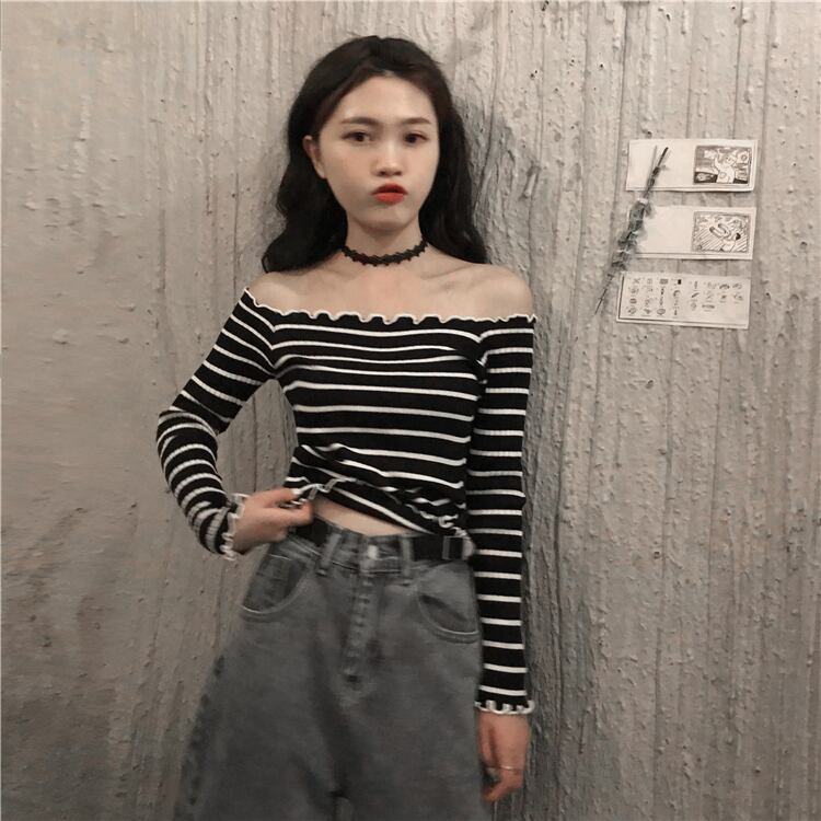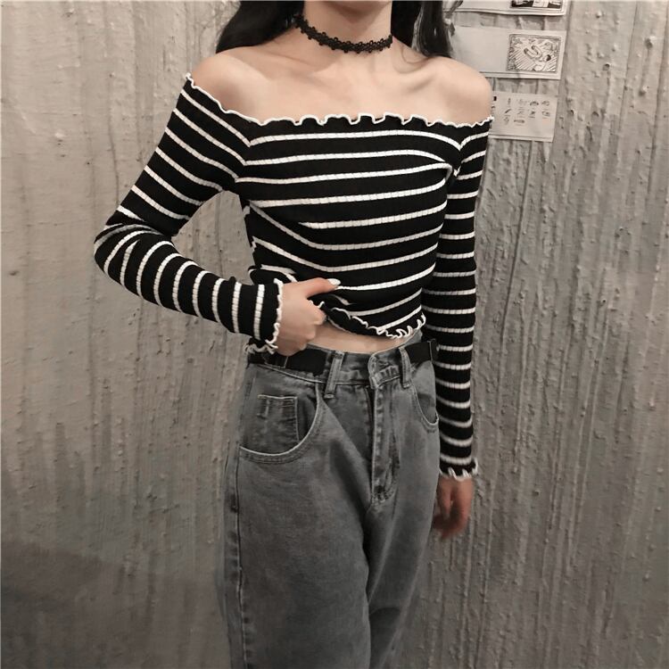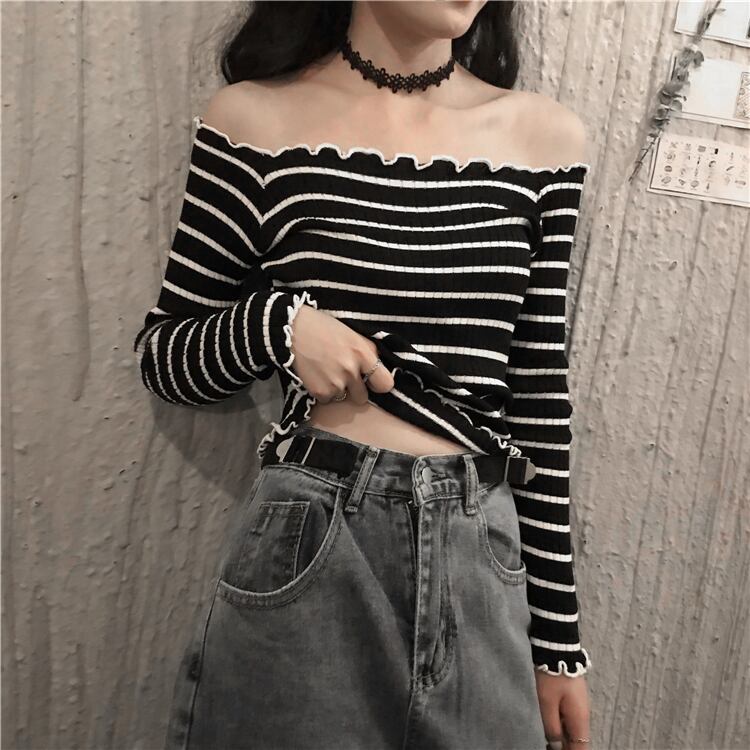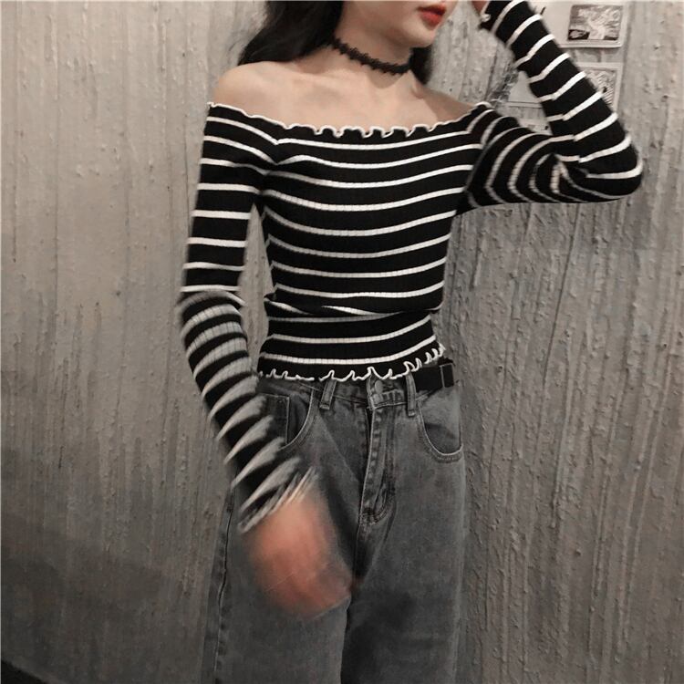 ✞ スタンダードストライプセーター スリムショートシャツブラウス ロング レトロ オフショルダー ✞ゴスロリ SM ミリ 甘ロリ クラロリ 和ロリ エレガント 黒ロリ 姫ロリ 華ロリ BB-BB51336147768