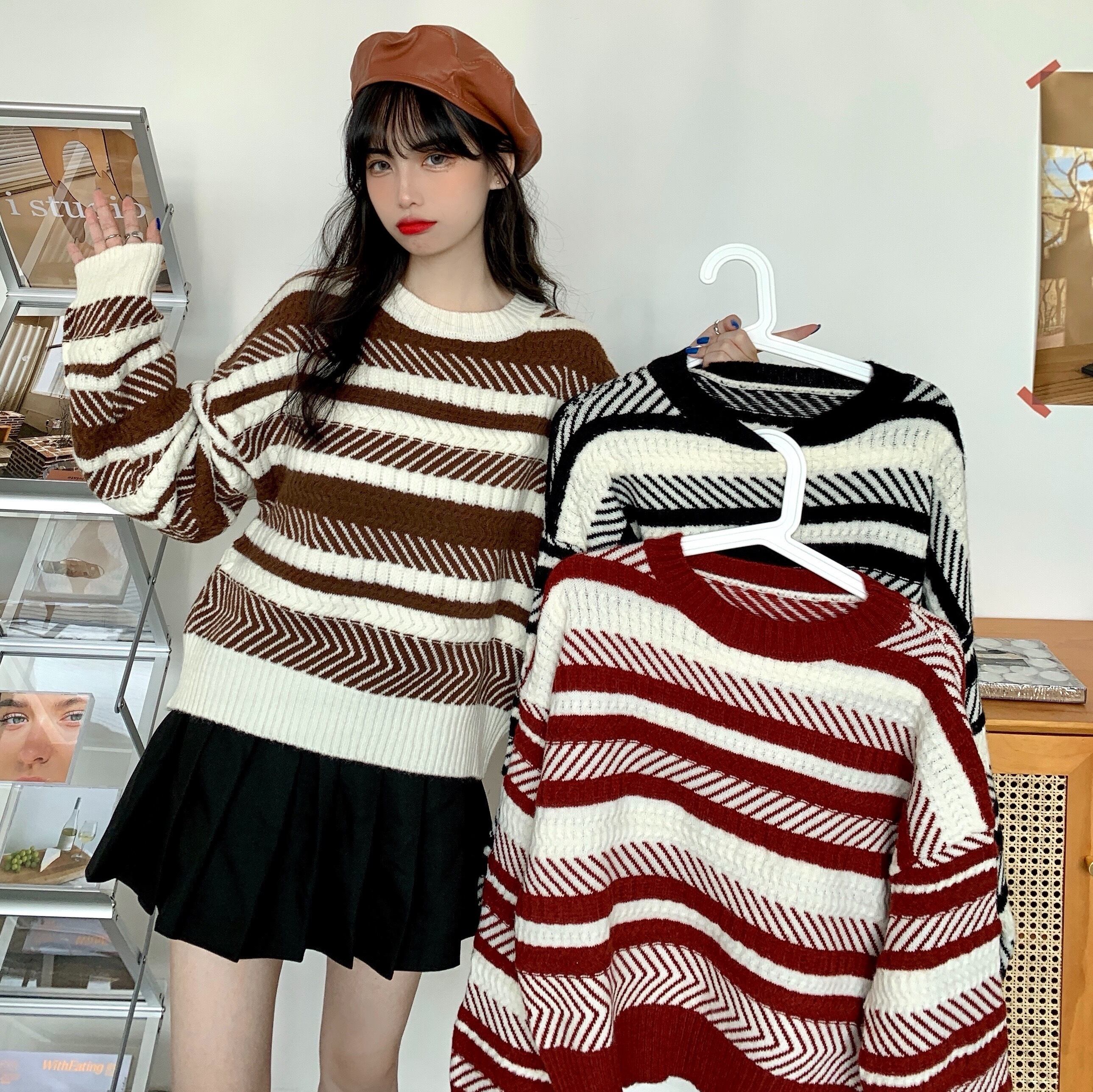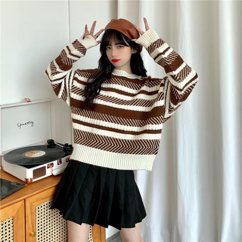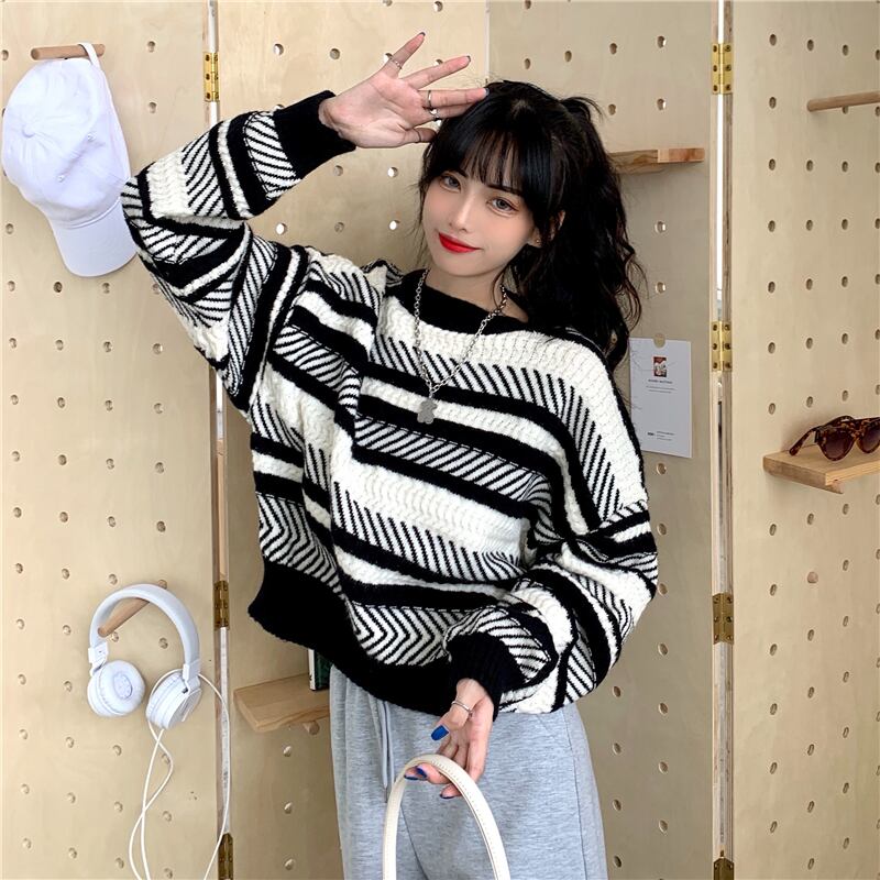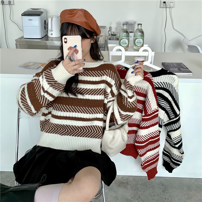 ✞ スタンダードストライプラウンドネックセーター ウィンタースリーブプルオーバー ニットトップス 大人女子☆ ランタンスリーブ レトロ 冬物 ✞ゴスロリ SM ミリ 甘ロリ クラロリ 和ロリ エレガント 黒ロリ 姫ロリ 華ロリ BB-BB66900033921