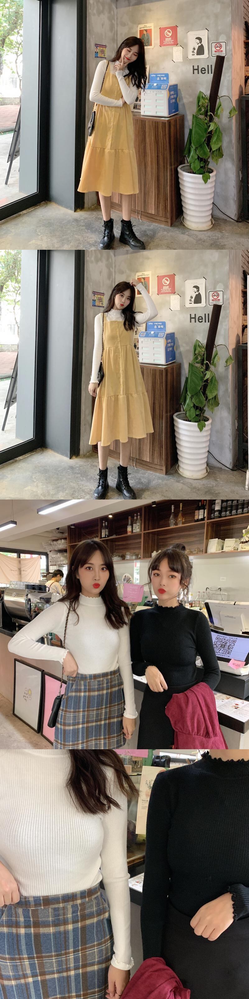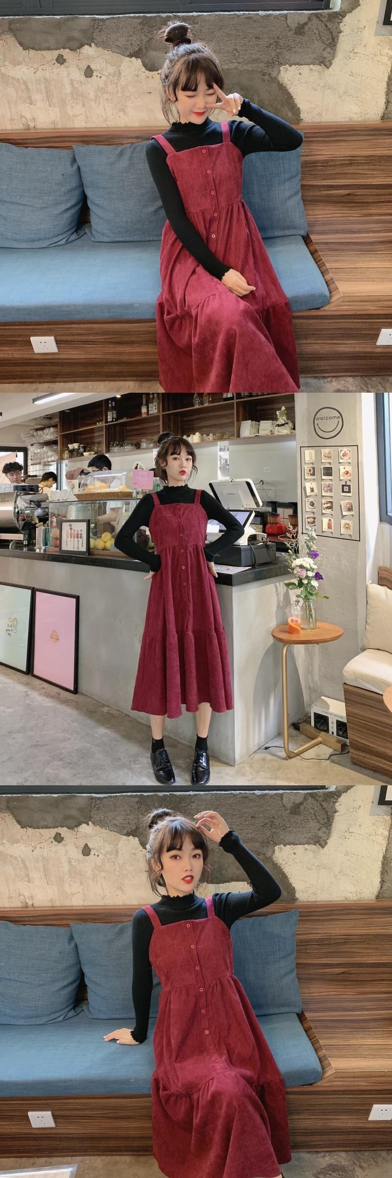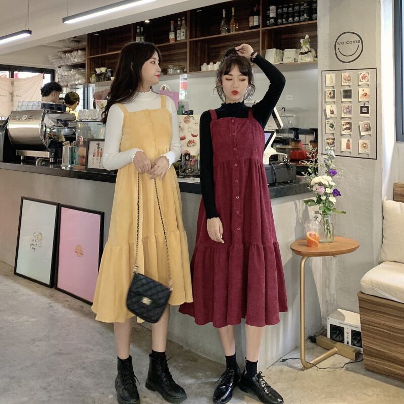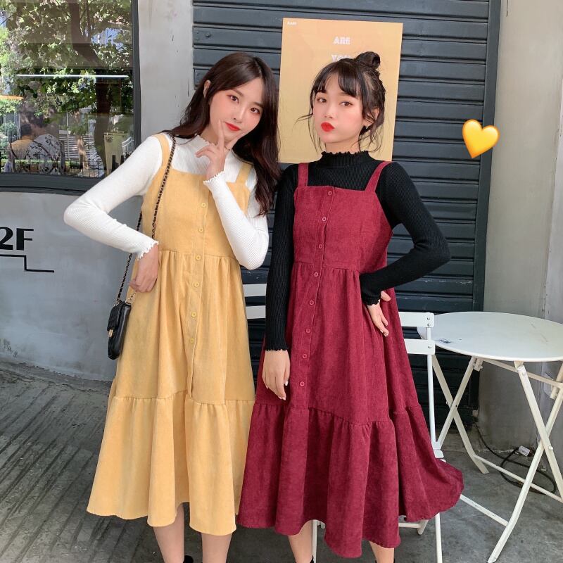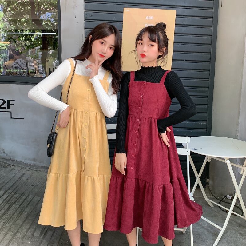 色:白いセーター(シングルピース),黒のセーター(シングルピース),黄色のサスペンダースカート(ワンピース),ワインレッドのサスペンダースカート(ワンピース)