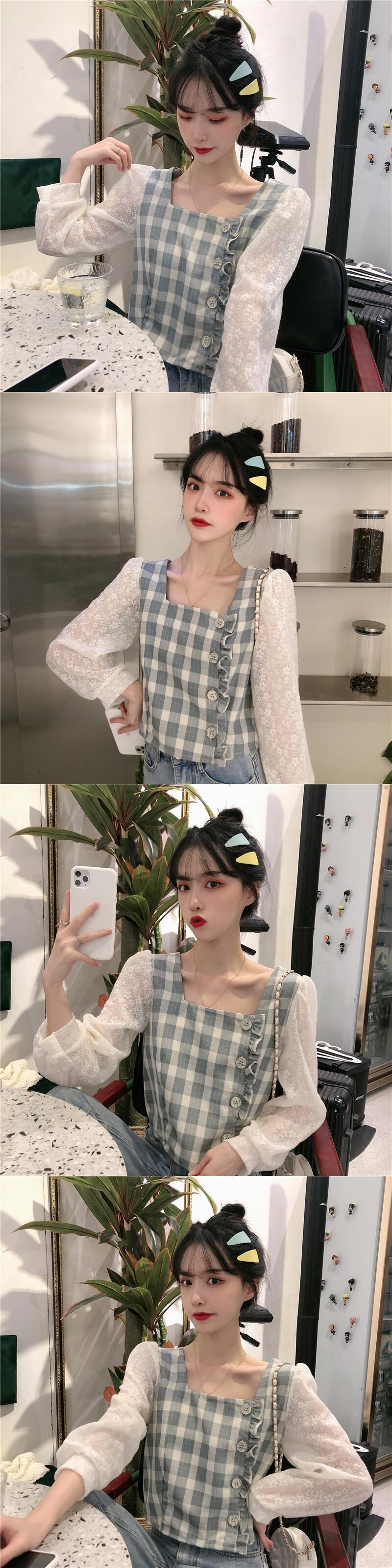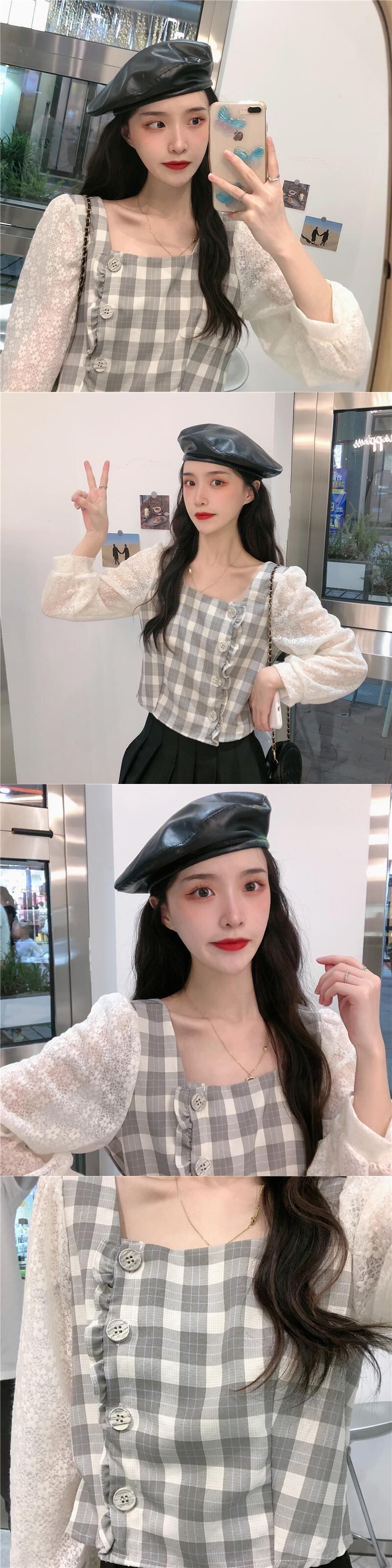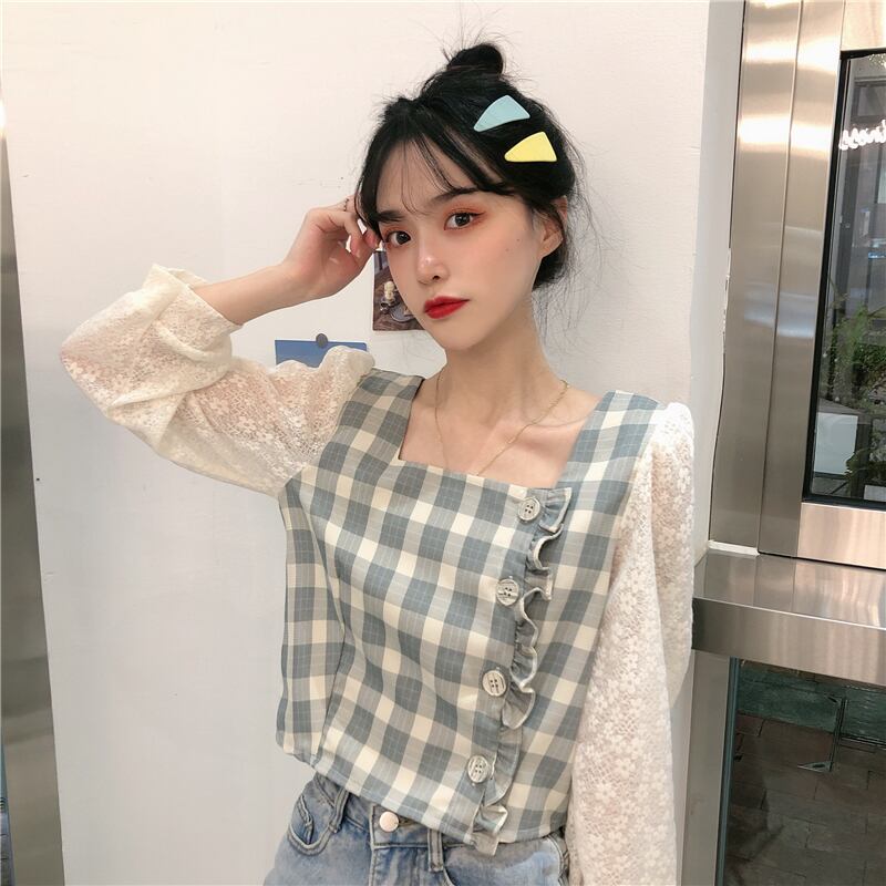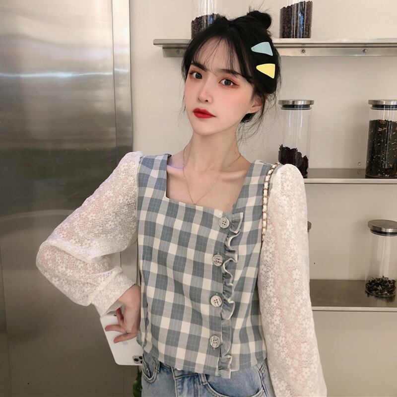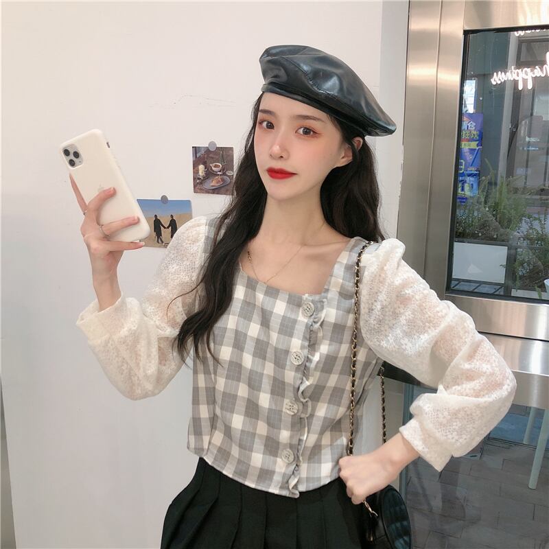 ✞ レーススタンダードチェック柄シャツブラウス♥カワイイ♥トップス 大人女子☆ ロング レトロ スクウェア ステッチ ✞ゴスロリ SM ミリ 甘ロリ クラロリ 和ロリ エレガント 黒ロリ 姫ロリ 華ロリ BB-BB4885918813