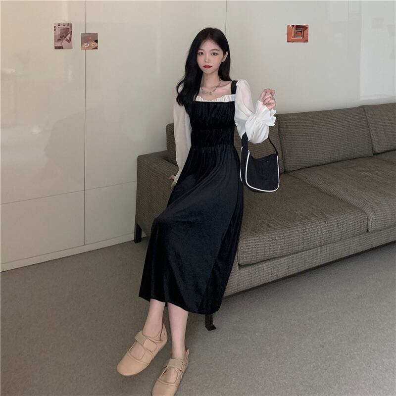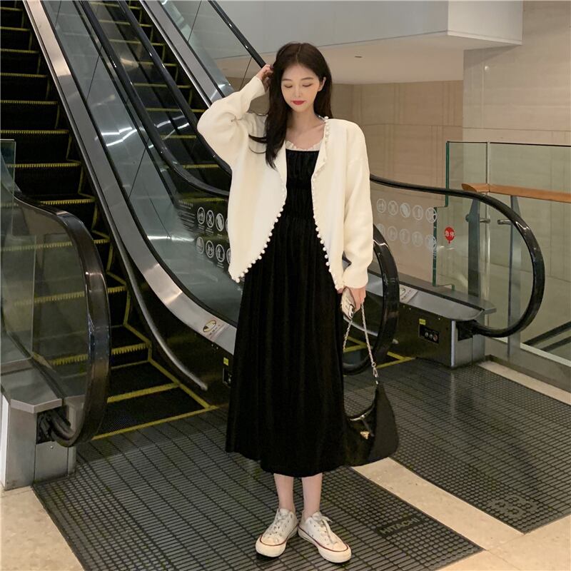 色:ブラックワンピース,白セーターコートシングル