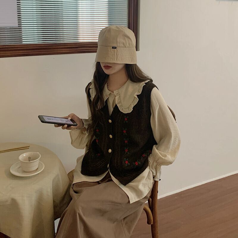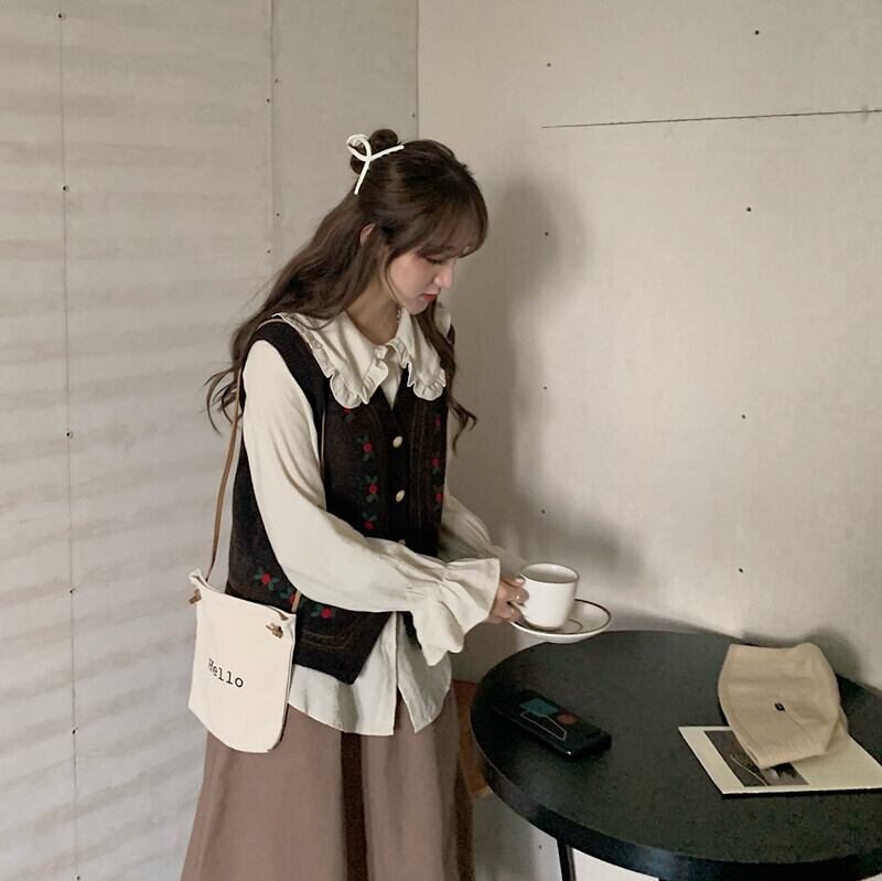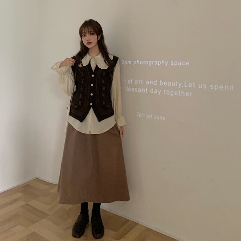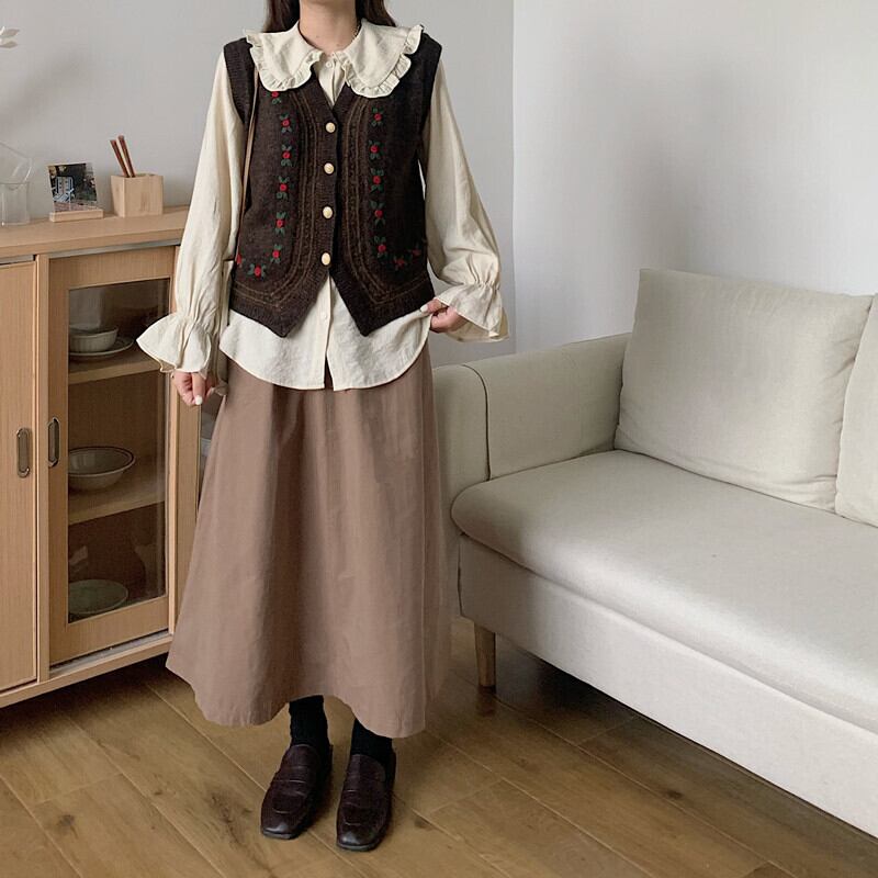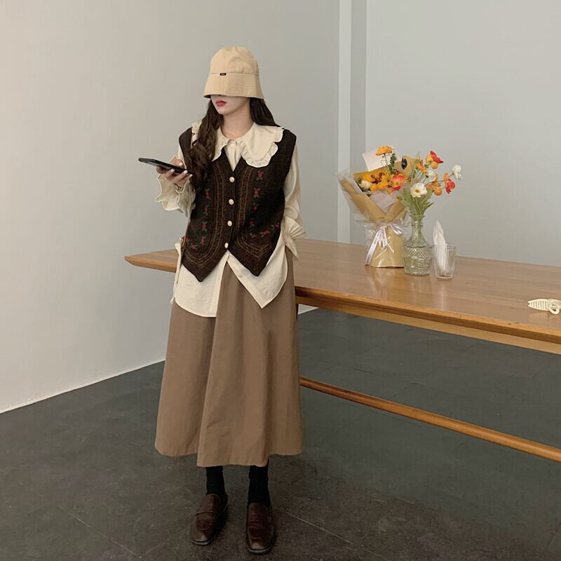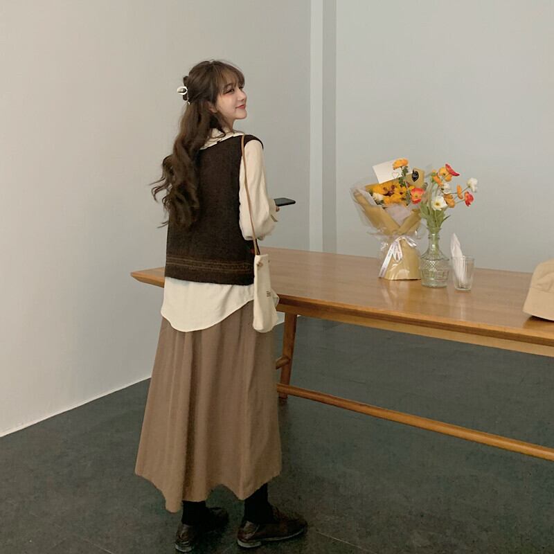 色:コーヒーカラーベストワンピース,ワンピースアプリコットシャツ,コーヒー色のスカートワンピース