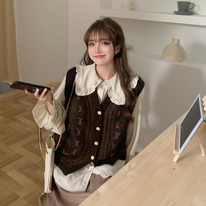 ✞ ニットカーディガンジャケット Vネックノースリーブ花柄刺繍セーター スウィート フラワーデザイン ✞ゴスロリ SM ミリ 甘ロリ クラロリ 和ロリ エレガント 黒ロリ 姫ロリ 華ロリ BB-BB68772062451