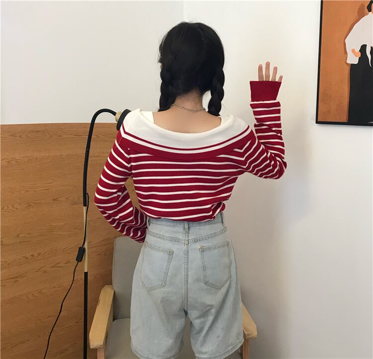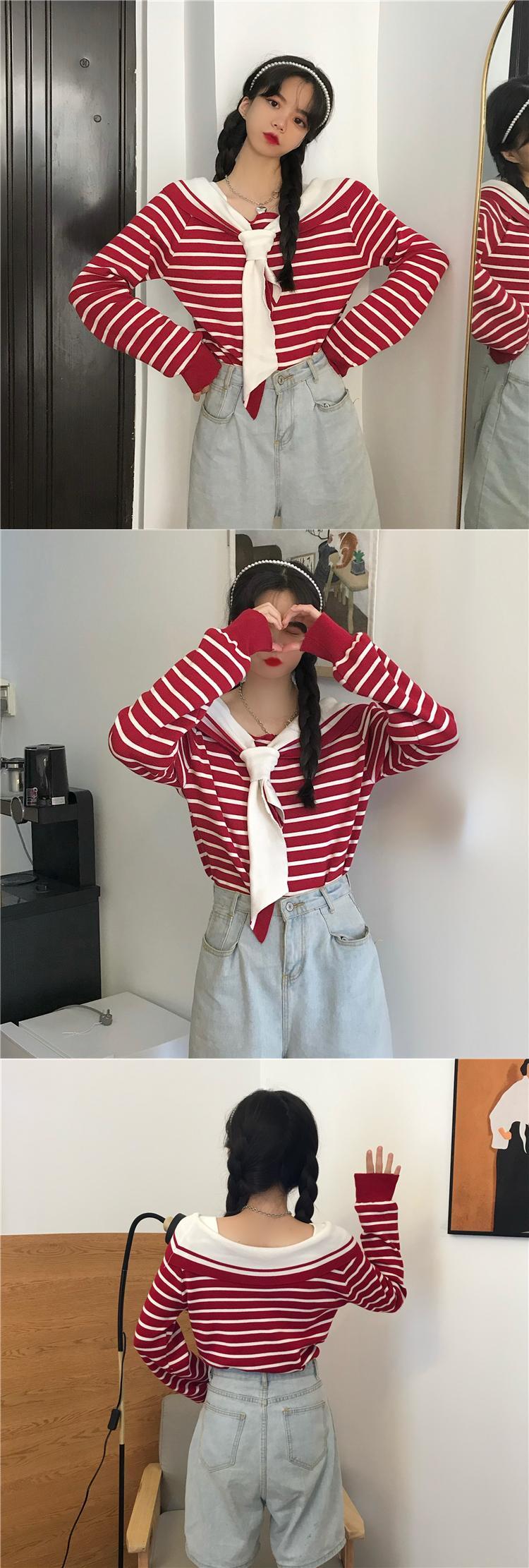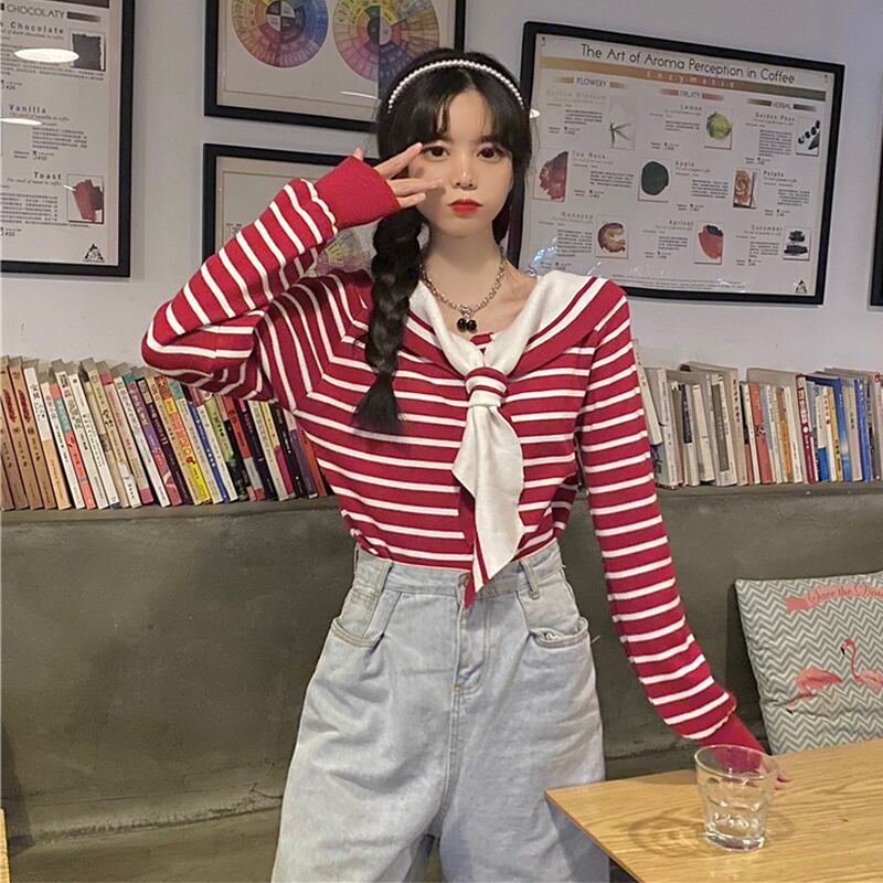 ✞ ♡ネイビープルオーバー カラーストライプニットシャツブラウスセーター ロング ✞ゴスロリ SM ミリ 甘ロリ クラロリ 和ロリ エレガント 黒ロリ 姫ロリ 華ロリ BB-BB51378475073