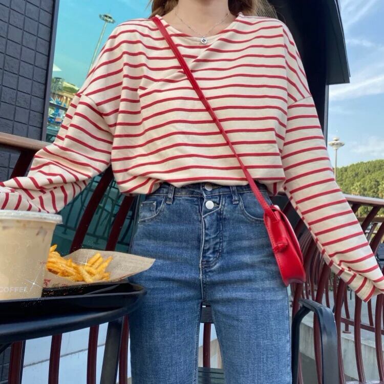 ✞ ラウンドネック長袖スリーブカラーストライプカジュアルTシャツ トップス 大人女子☆ ロング ✞ゴスロリ SM ミリ 甘ロリ クラロリ 和ロリ エレガント 黒ロリ 姫ロリ 華ロリ BB-BB28324815852