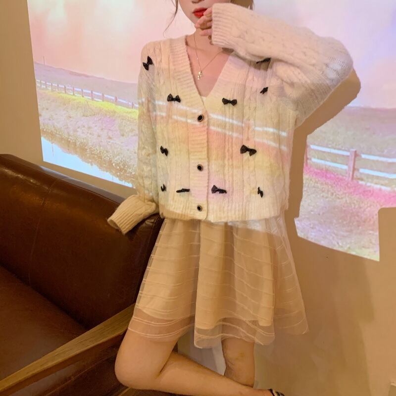 ✞ Vネックニットカーディガン♡スリムセーター ロング リボン スウィート ✞ゴスロリ SM ミリ 甘ロリ クラロリ 和ロリ エレガント 黒ロリ 姫ロリ 華ロリ BB-BB96720492605