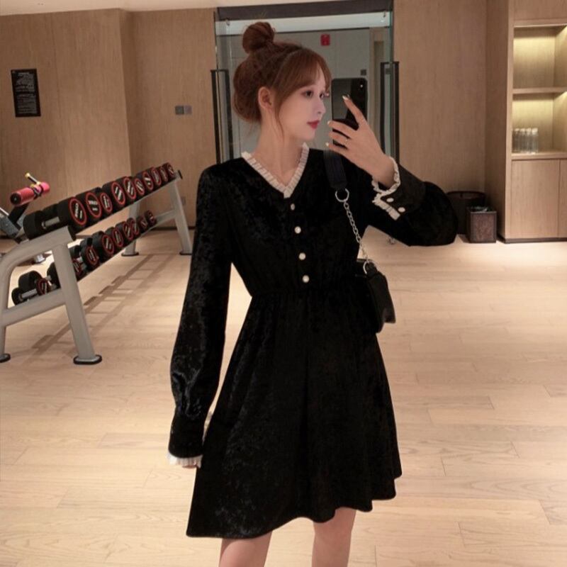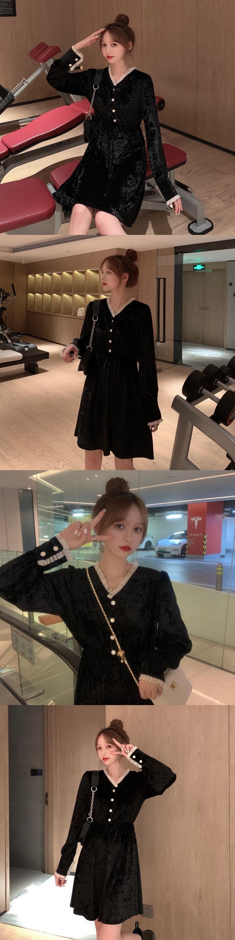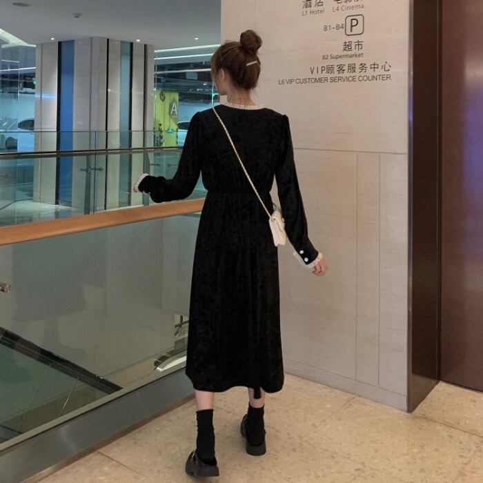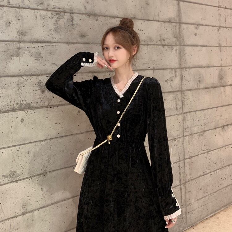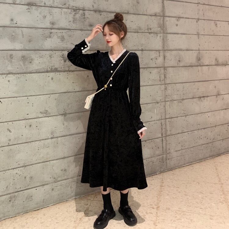 ✞ Vネック★♥カワイイ♥ブラックベルベット ロング ✞ゴスロリ SM ミリ 甘ロリ クラロリ 和ロリ エレガント 黒ロリ 姫ロリ 華ロリ BB-BB59821393997