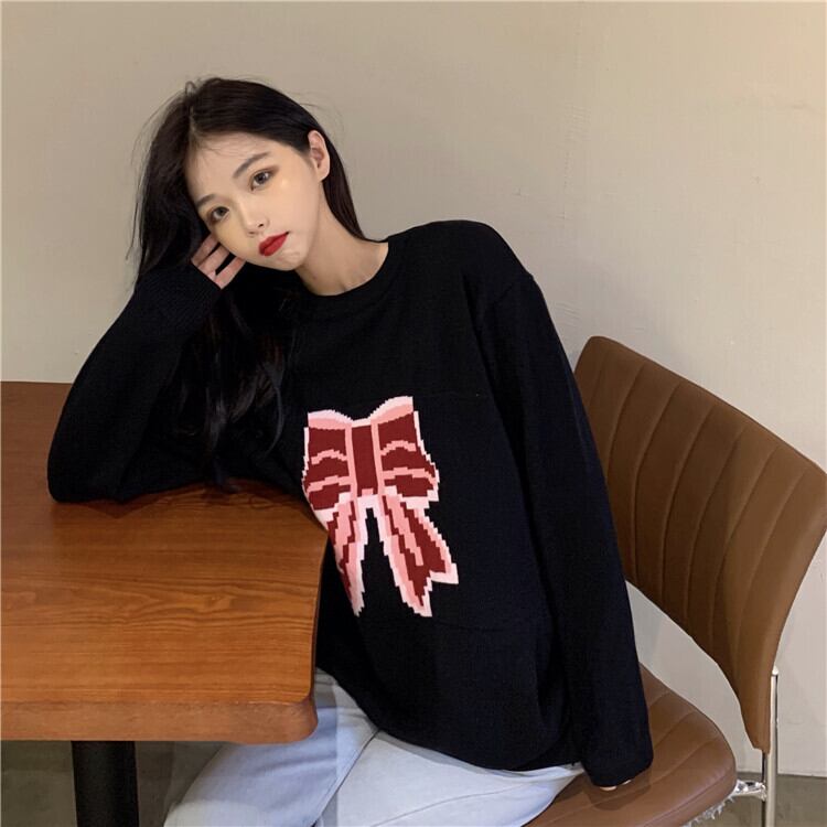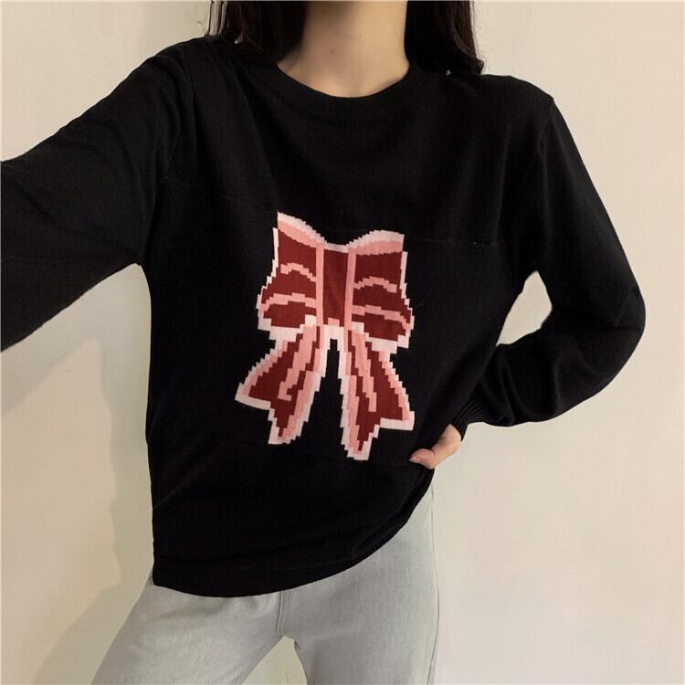 ✞ リボンプリント柄ニットプルオーバー シャツブラウスウィンターセーター 大人女子☆ ロング スウィート 冬物 ✞ゴスロリ SM ミリ 甘ロリ クラロリ 和ロリ エレガント 黒ロリ 姫ロリ 華ロリ BB-BB8060788416