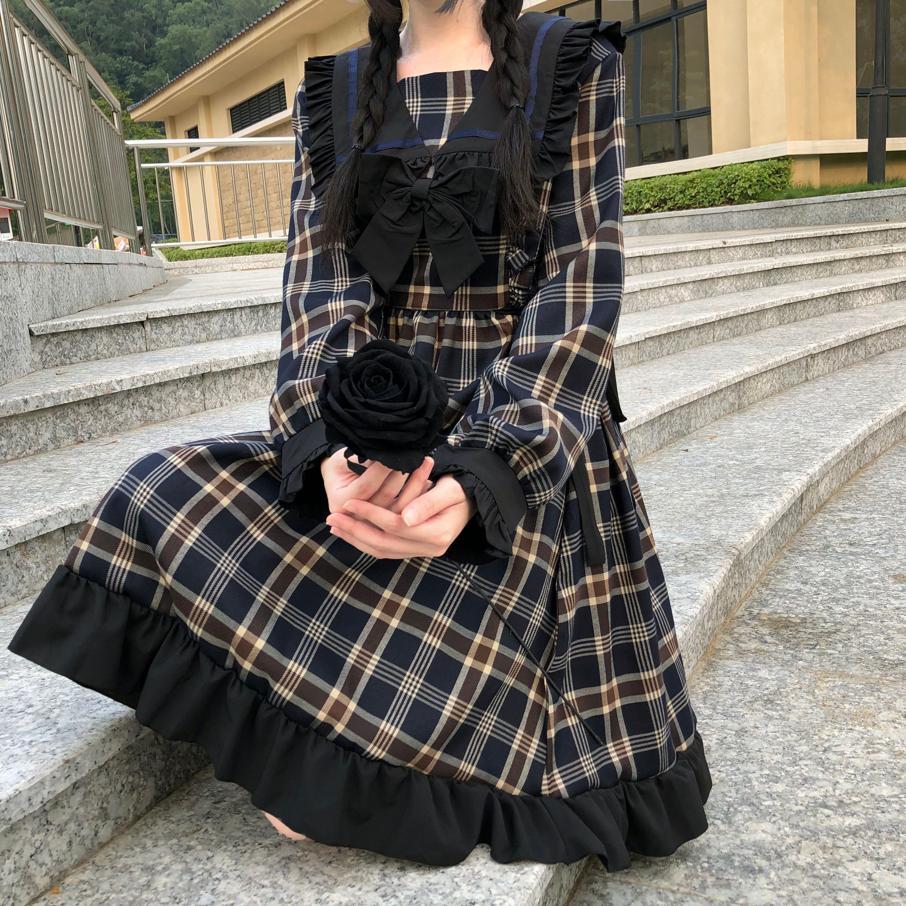 ✞ スカート ♡リボンネイビー長袖スリーブスタンダードチェック柄ラッフル ロング レトロ スウィート ✞ゴスロリ SM ミリ 甘ロリ クラロリ 和ロリ エレガント 黒ロリ 姫ロリ 華ロリ BB-BB49538714890