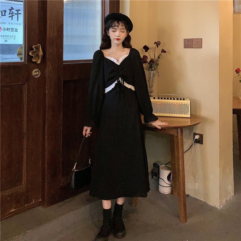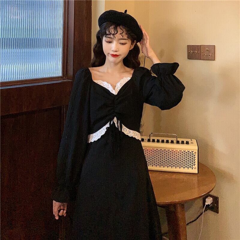 ✞ ドレス ワンピースレースサイドギャザーロング★♥カワイイ♥ブラック 長袖 スウィート スクウェア ステッチ ✞ゴスロリ SM ミリ 甘ロリ クラロリ 和ロリ エレガント 黒ロリ 姫ロリ 華ロリ BB-BB67531951343