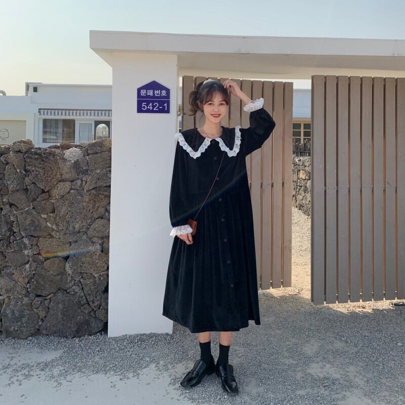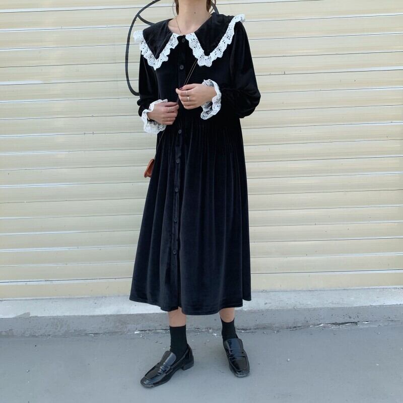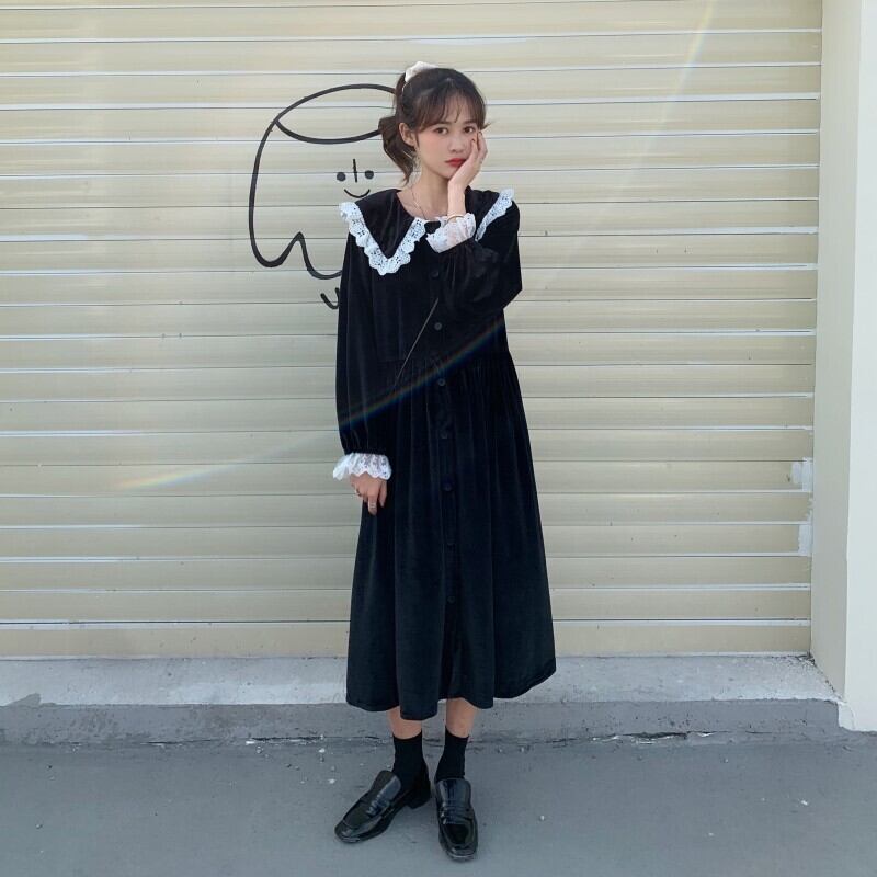 ✞レースベルベット長袖スリーブワンピースドレス ルーズ ブラック ロング スウィート 秋冬✞ゴスロリ SM ミリ 甘ロリ クラロリ 和ロリ エレガント 黒ロリ 姫ロリ 華ロリ BB-BB44991968292