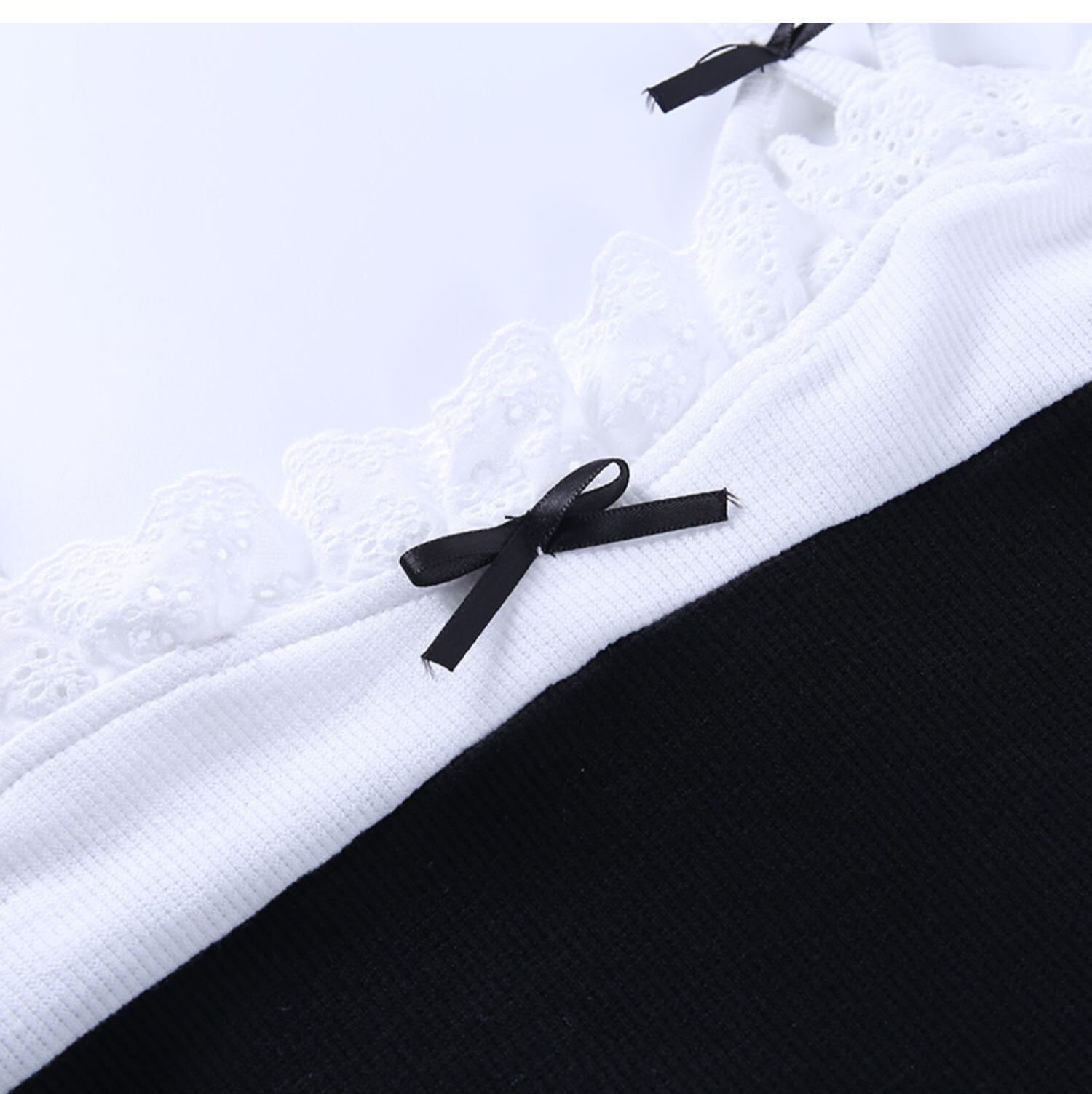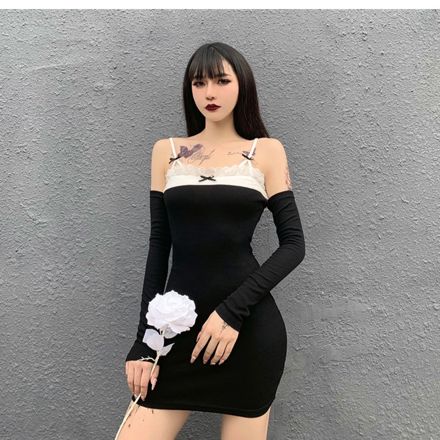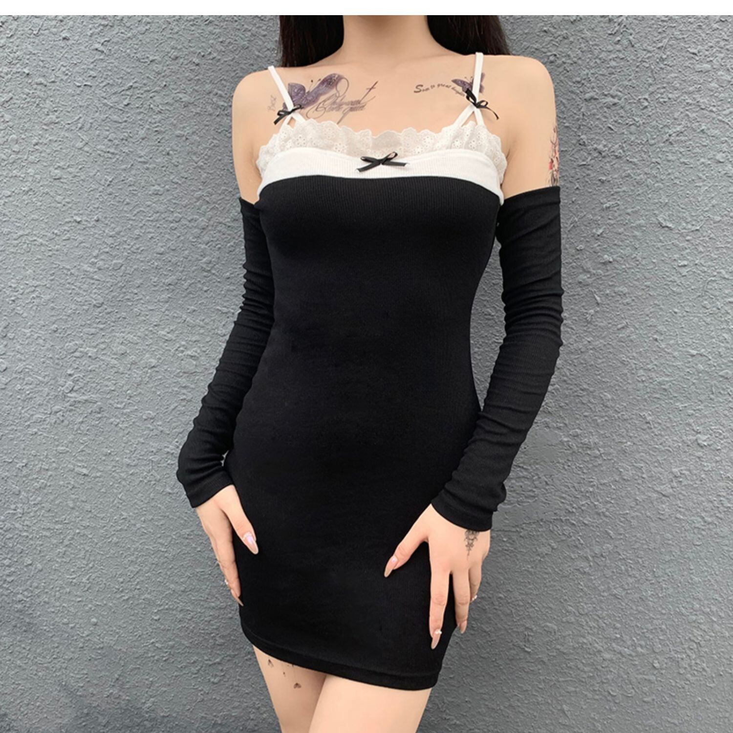 ✞ダークレースフリルりぼんハイウェストタイトニットワンピースドレスOP 黒 ロング ステッチ ✞✝✞ ゴスロリ SM ミリ 甘ロリ クラロリ 和ロリ エレガント 黒ロリ 姫ロリ 華ロリ AA-AA99423025035