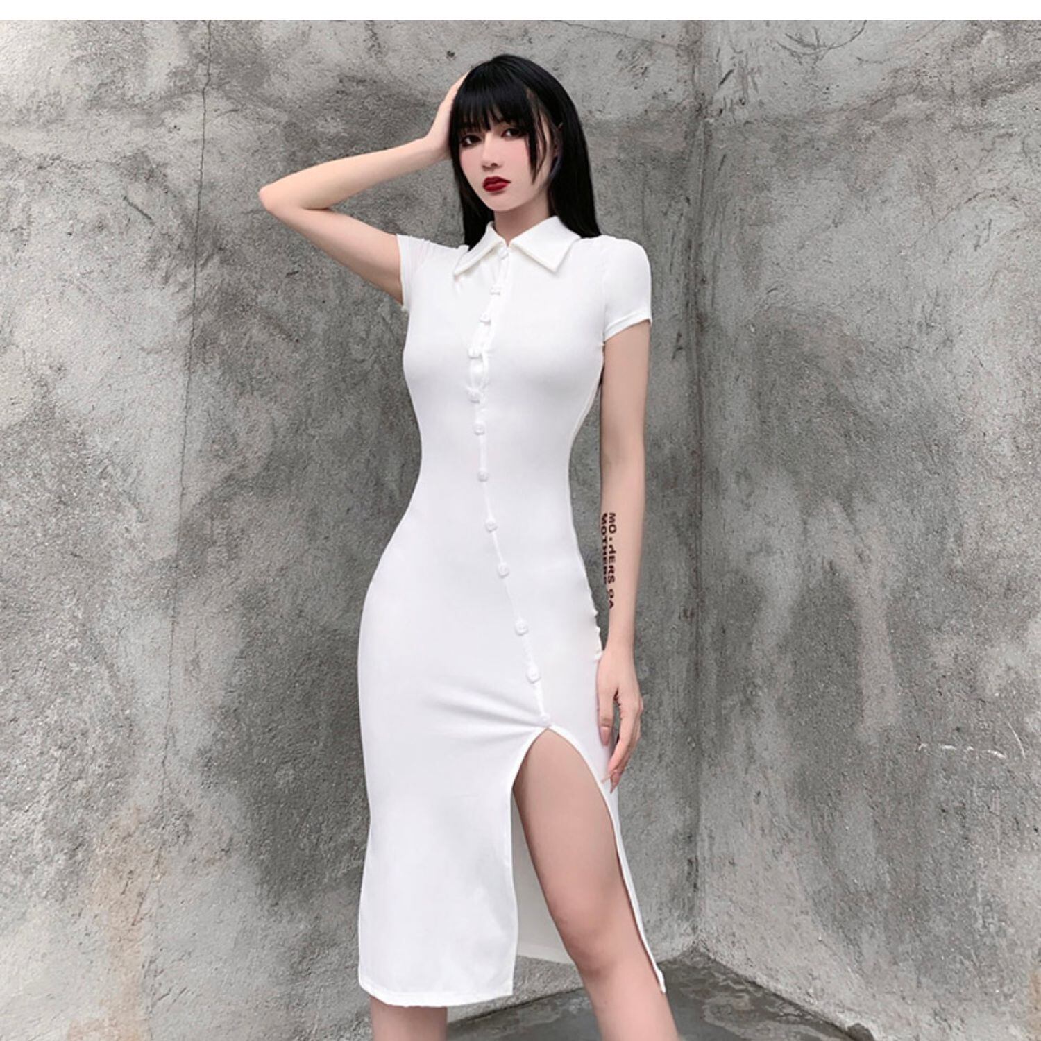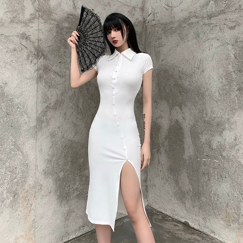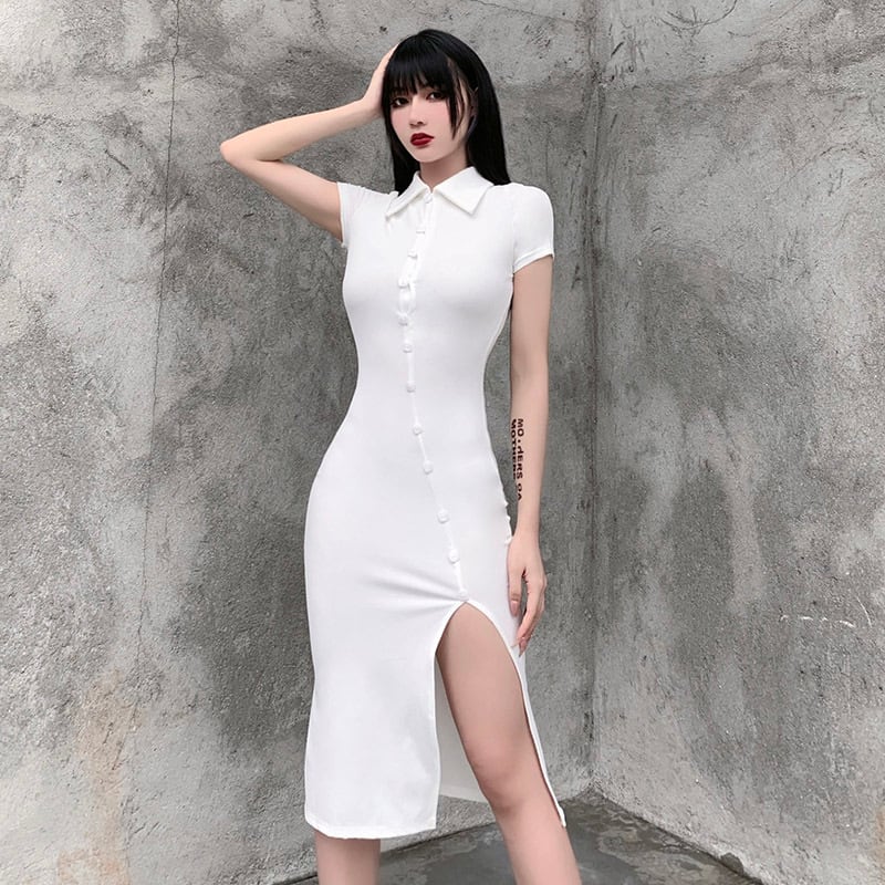 ✞ゴシックボタンタイトスリット入りハイウェストワンピースドレスOP ソリッドカラー シャツブラウス スカート 大人女子 チャイナ風☆ホワイト✞✝✞ ゴスロリ SM ミリ 甘ロリ クラロリ 和ロリ エレガント 黒ロリ 姫ロリ 華ロリ AA-AA19311729984