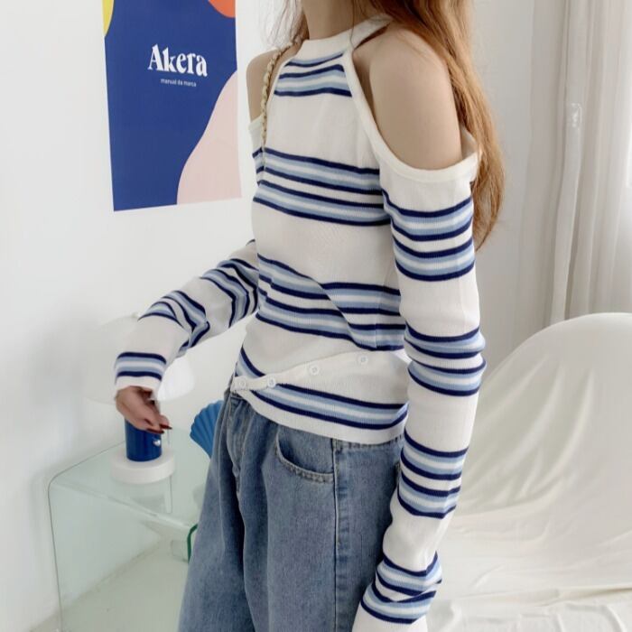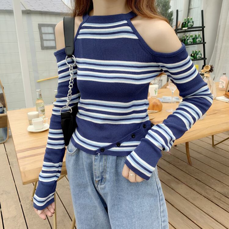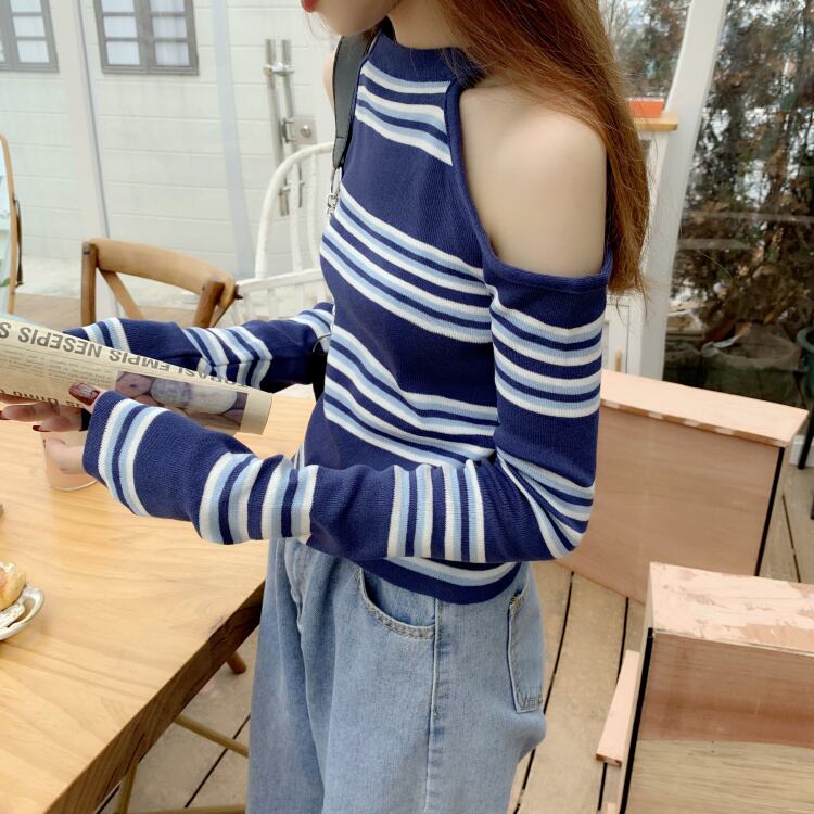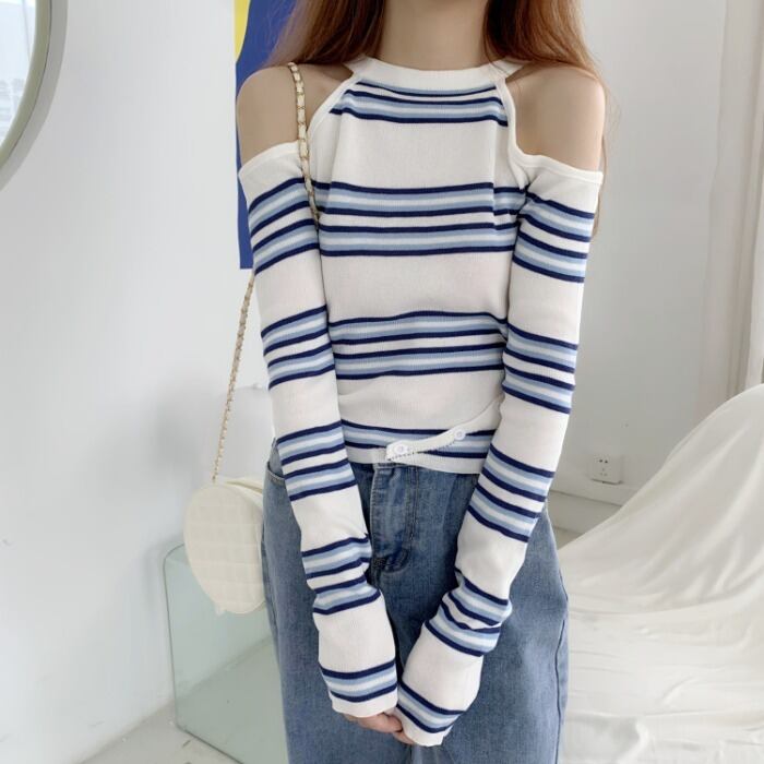 ✞ストライプ肩だしニットセーター ストラップレス シャツブラウス ロングスリーブ ✞ゴスロリ SM ミリ 甘ロリ クラロリ 和ロリ エレガント 黒ロリ 姫ロリ 華ロリ BB-BB19908805824