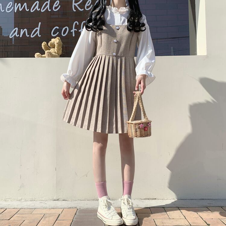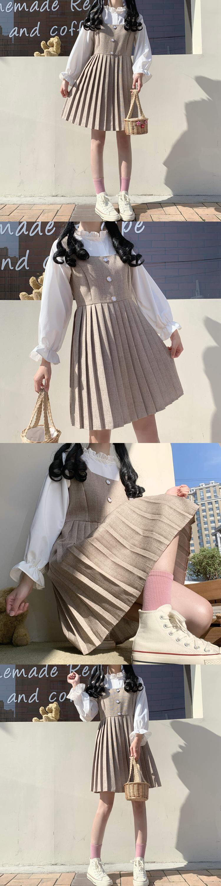 ✞プリーツストラップワンピースドレス or ホワイトブラウス スカート ブラック カーキ 大人女子☆レトロ スウィート 秋冬✞ゴスロリ SM ミリ 甘ロリ クラロリ 和ロリ エレガント 黒ロリ 姫ロリ 華ロリ BB-BB15101776751