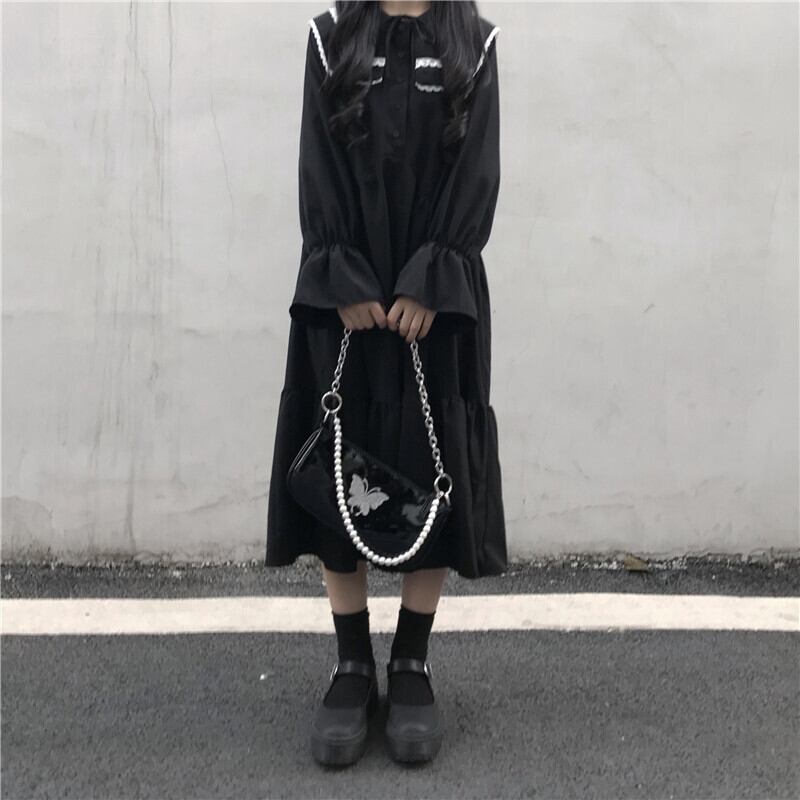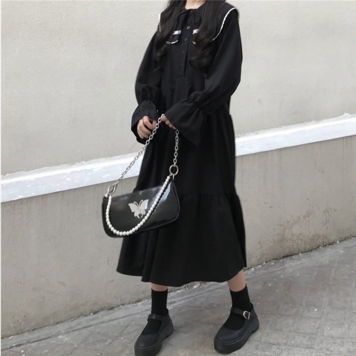 ✞ゴシックロリータプリーツ制服ワンピースドレスOP ベルスリーブ ウィンター ロング 秋物 冬物 ✞ゴスロリ SM ミリ 甘ロリ クラロリ 和ロリ エレガント 黒ロリ 姫ロリ 華ロリ BB-BB4346348087