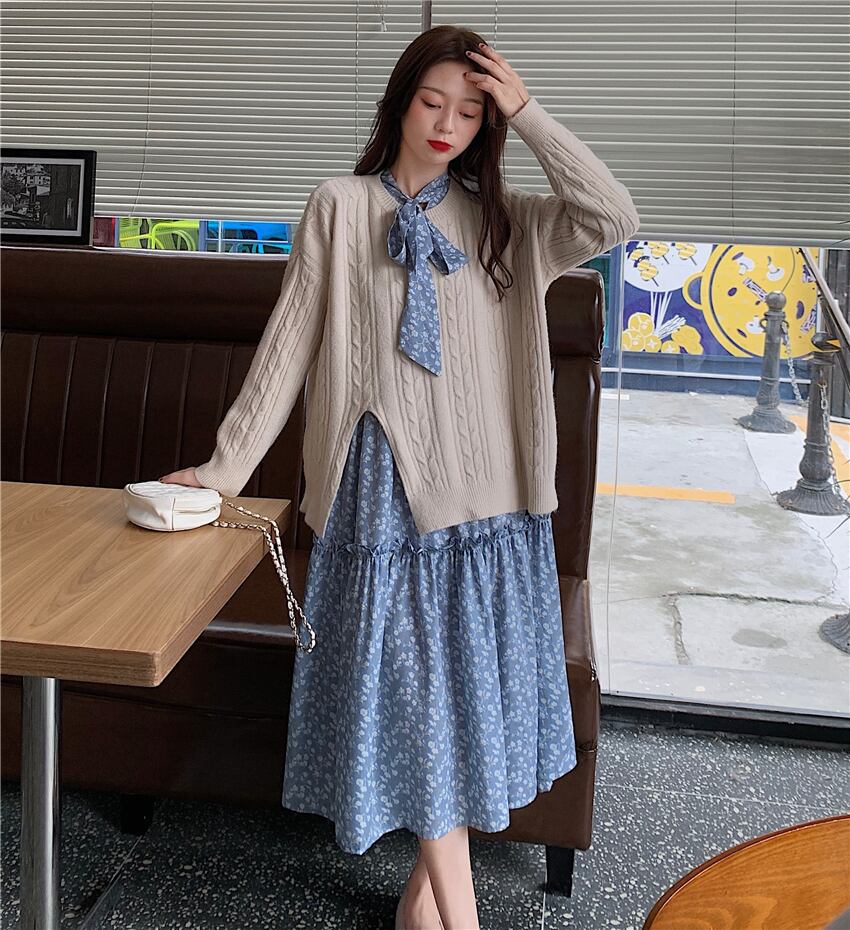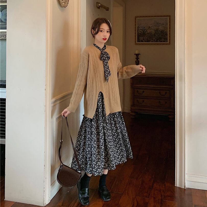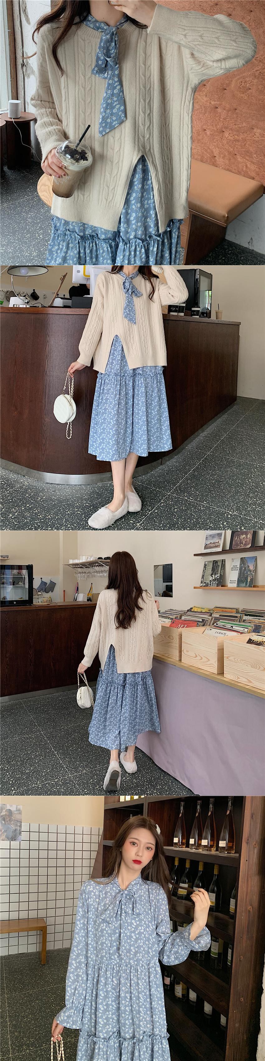 色:アプリコットセーター,カードカラーセーター,ブルーフローラルスカート,黒花柄スカート