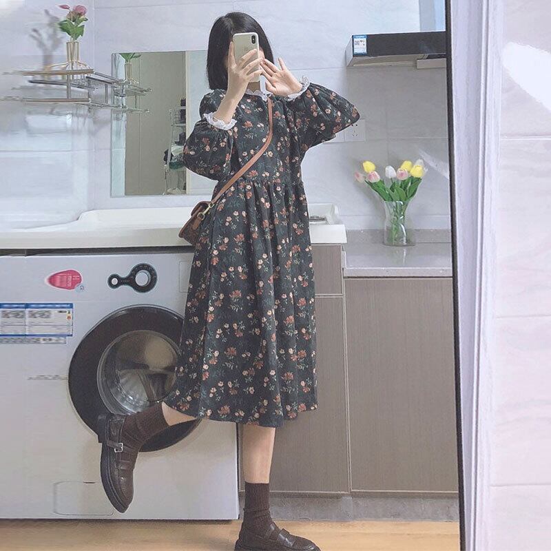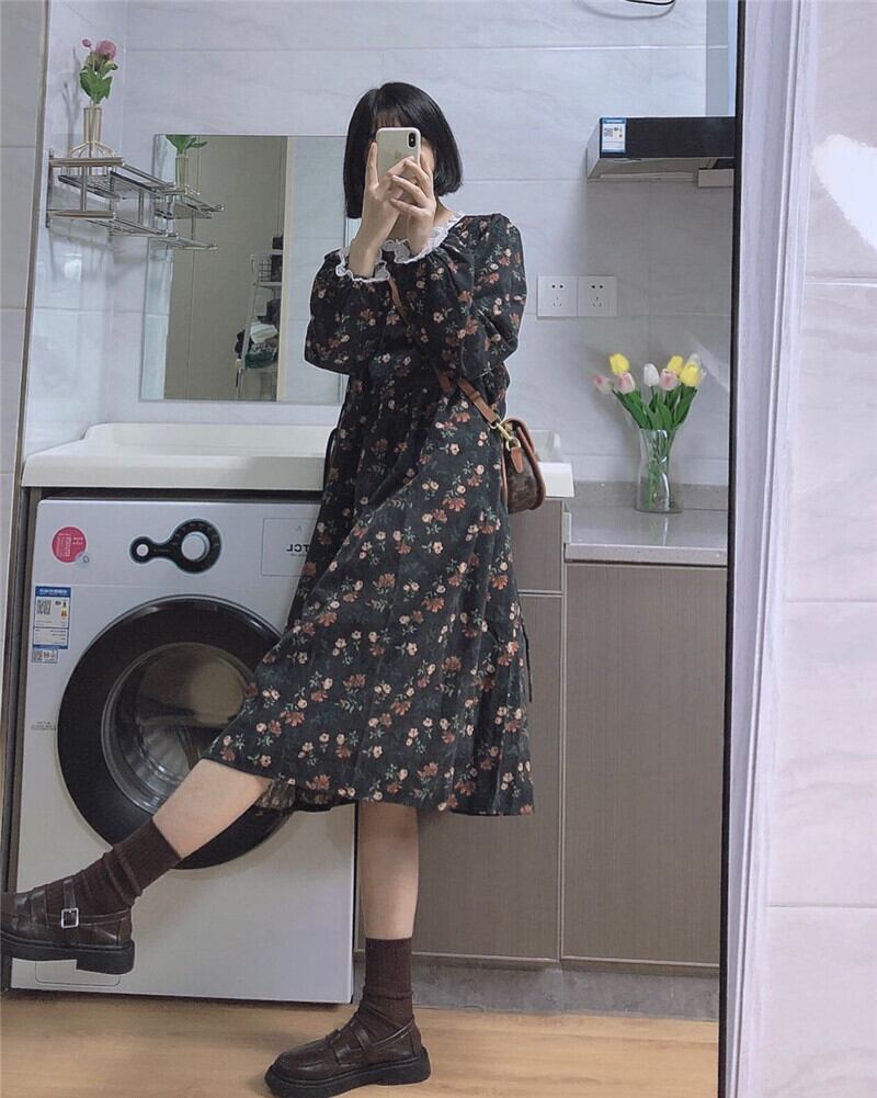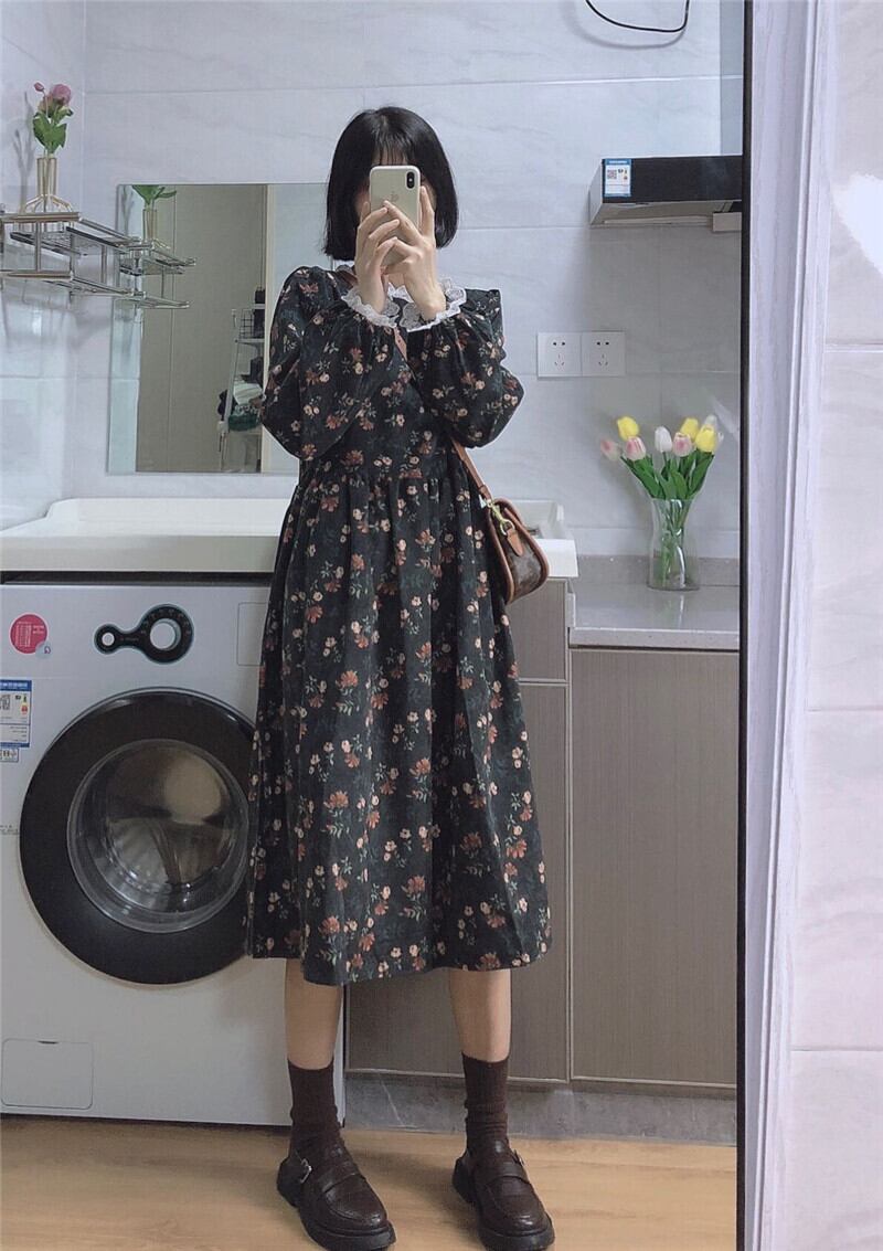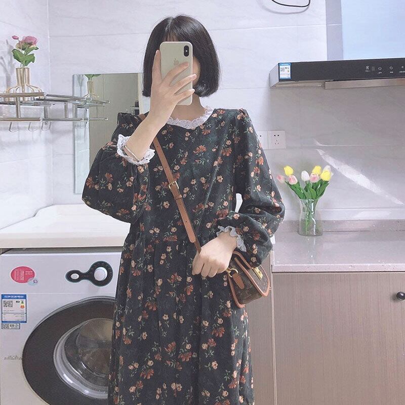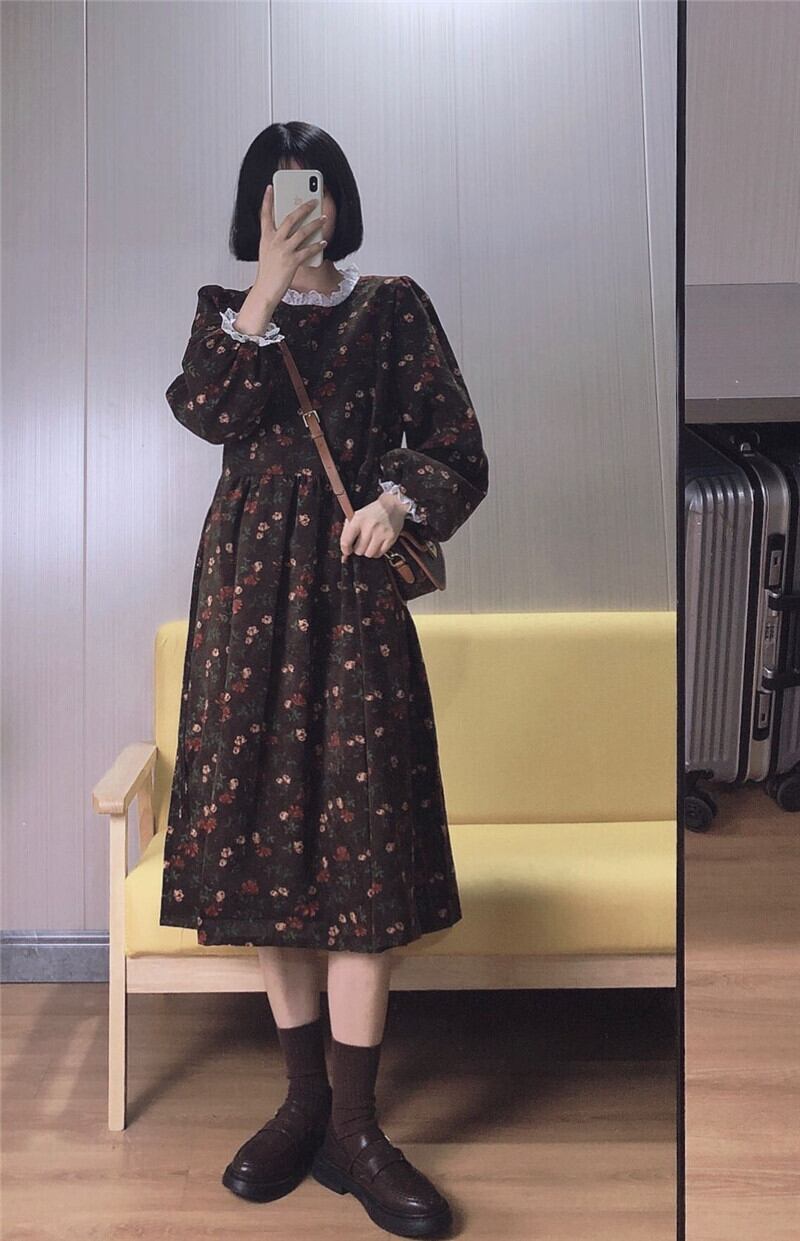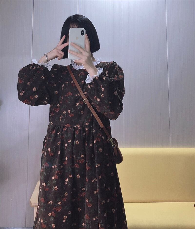 ✞甘めレースサイドラウンドネック花柄ワンピースドレスOP♥スリーブ長袖 ウィンター ロング レトロ 秋冬✞ゴスロリ SM ミリ 甘ロリ クラロリ 和ロリ エレガント 黒ロリ 姫ロリ 華ロリ BB-BB33357687795