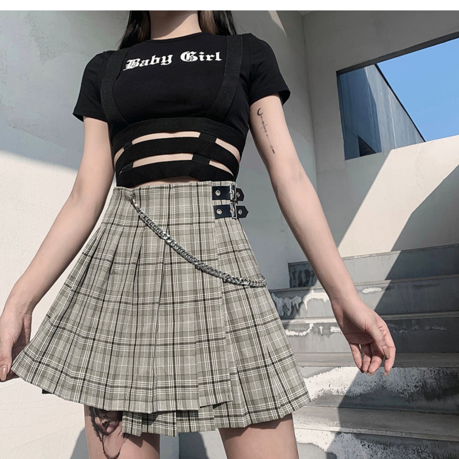 ✞ Aラインアシンメトリーグリーンチェック柄プリーツスカート ショート ステッチ チェーン✞✝✞ ゴスロリ SM ミリ 甘ロリ クラロリ 和ロリ エレガント 黒ロリ 姫ロリ 華ロリ AA-AA31538251828